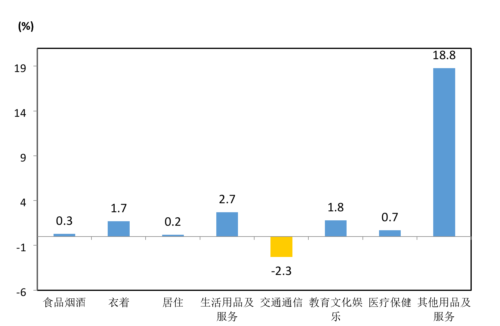 其他七大类价格同比“六涨一降”。其中,其他用品及服务、生活用品及服务、教育文化娱乐、衣着、医疗保健、居住价格分别上涨18.8%、2.7%、1.8%、1.7%、0.7%和0.2%;交通通信价格下降2.3%。