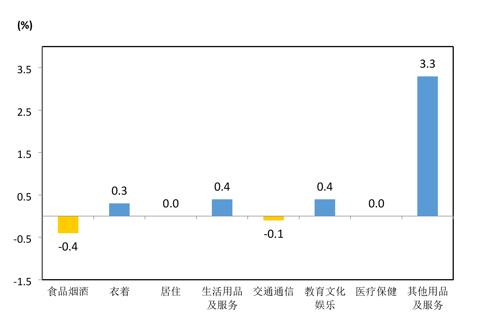 其他七大类价格环比“四涨一降二平”。其中,其他用品及服务、教育文化娱乐、生活用品及服务、衣着价格分别上涨3.3%、0.4%、0.4%和0.3%;交通通信价格下降0.1%;居住价格和医疗保健价格与上月持平。