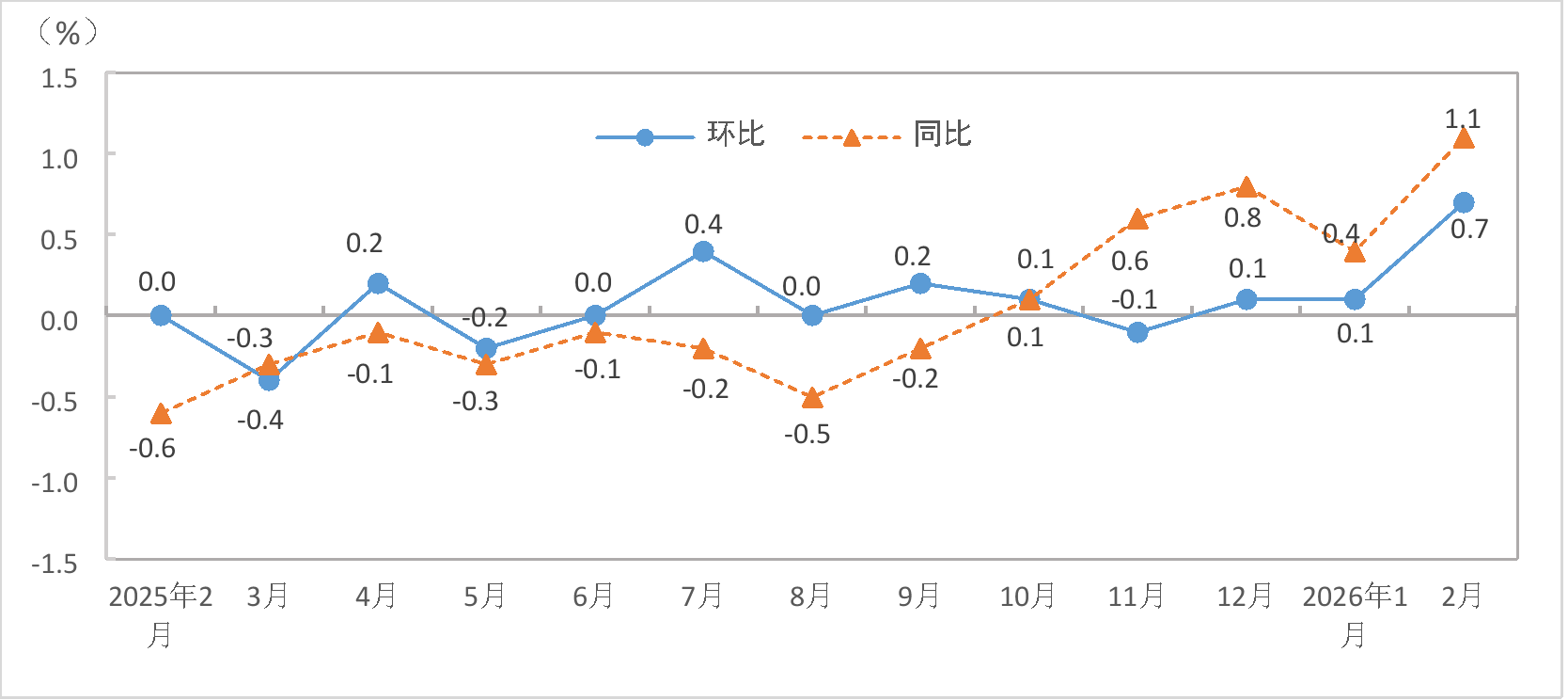 图1 湖南居民消费价格涨跌幅(2025.2-2026.2,单位:%)