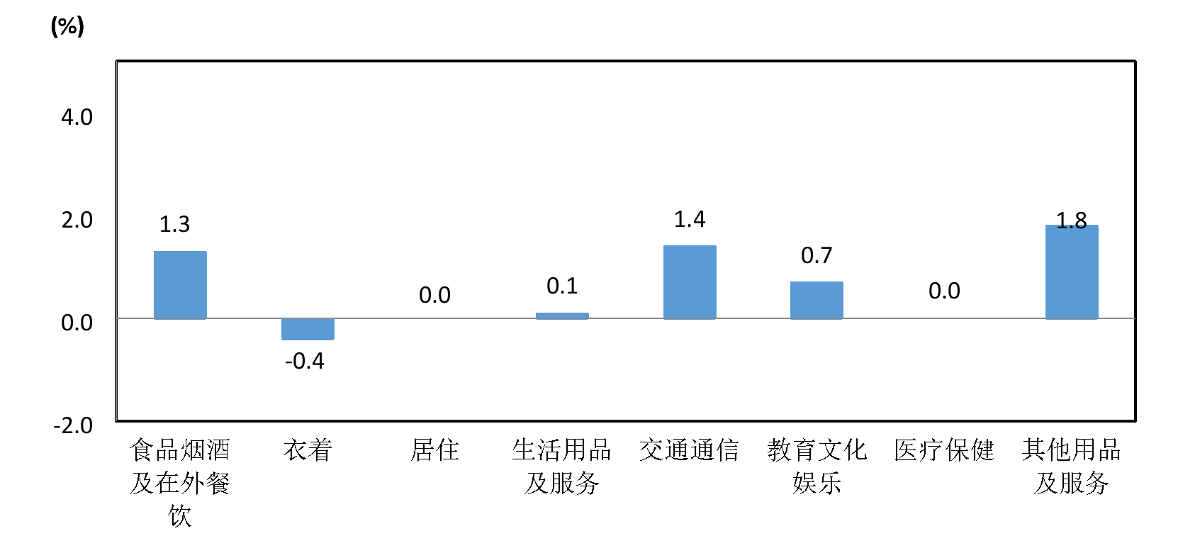 其他七大类价格环比四涨一降二平。其中,其他用品及服务、交通通信价格、教育文化娱乐和生活用品及服务价格分别上涨1.8%、1.4%、0.7%和0.1%;衣着价格下降0.4%;医疗保健和居住价格与上月持平。